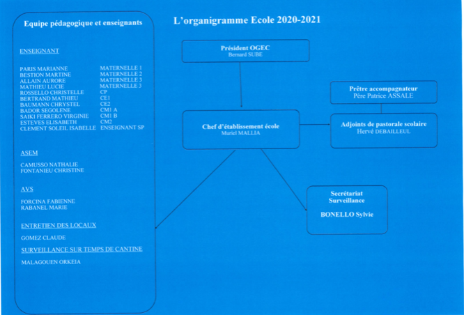 Télécharger l'organigramme de l'école"Une école qui aide l'enfant à faire fructifier ses talents, bâtir sa personnalité, s'intégrer dans la société, donner aux autres l'amour qu'il reçoit."