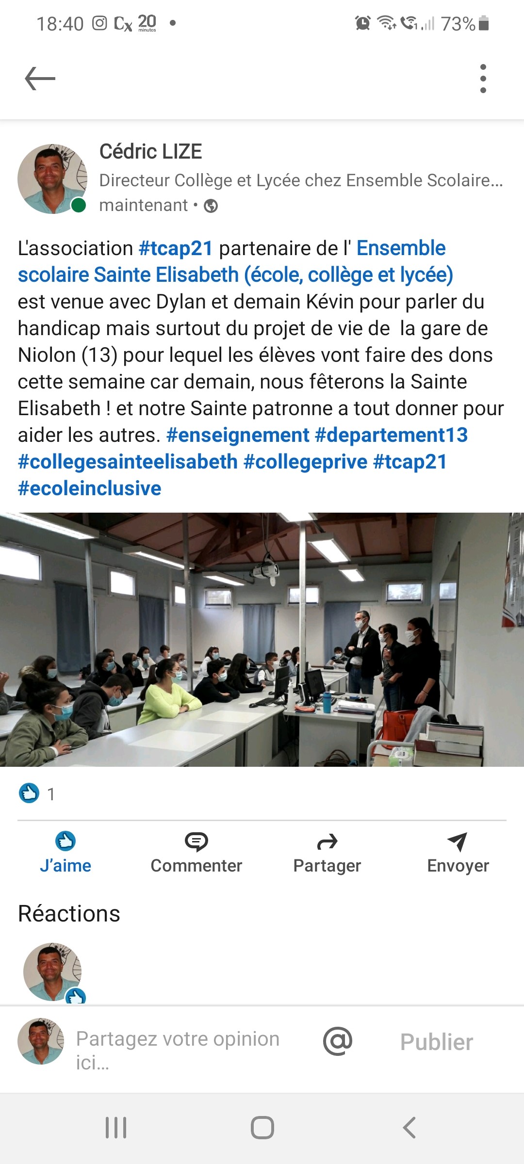 L'association tcap21 partenaire de l' Ensemble scolaire Sainte Elisabeth (école, collège et lycée) est venue avec Dylan et Kévin pour parler du handicap mais surtout du projet de vie de la gare de Niolon (13) pour lequel les élèves vont faire des dons cette semaine car demain, nous fêterons la Sainte Elisabeth ! Et notre Sainte patronne a tout donné pour aider les autres.