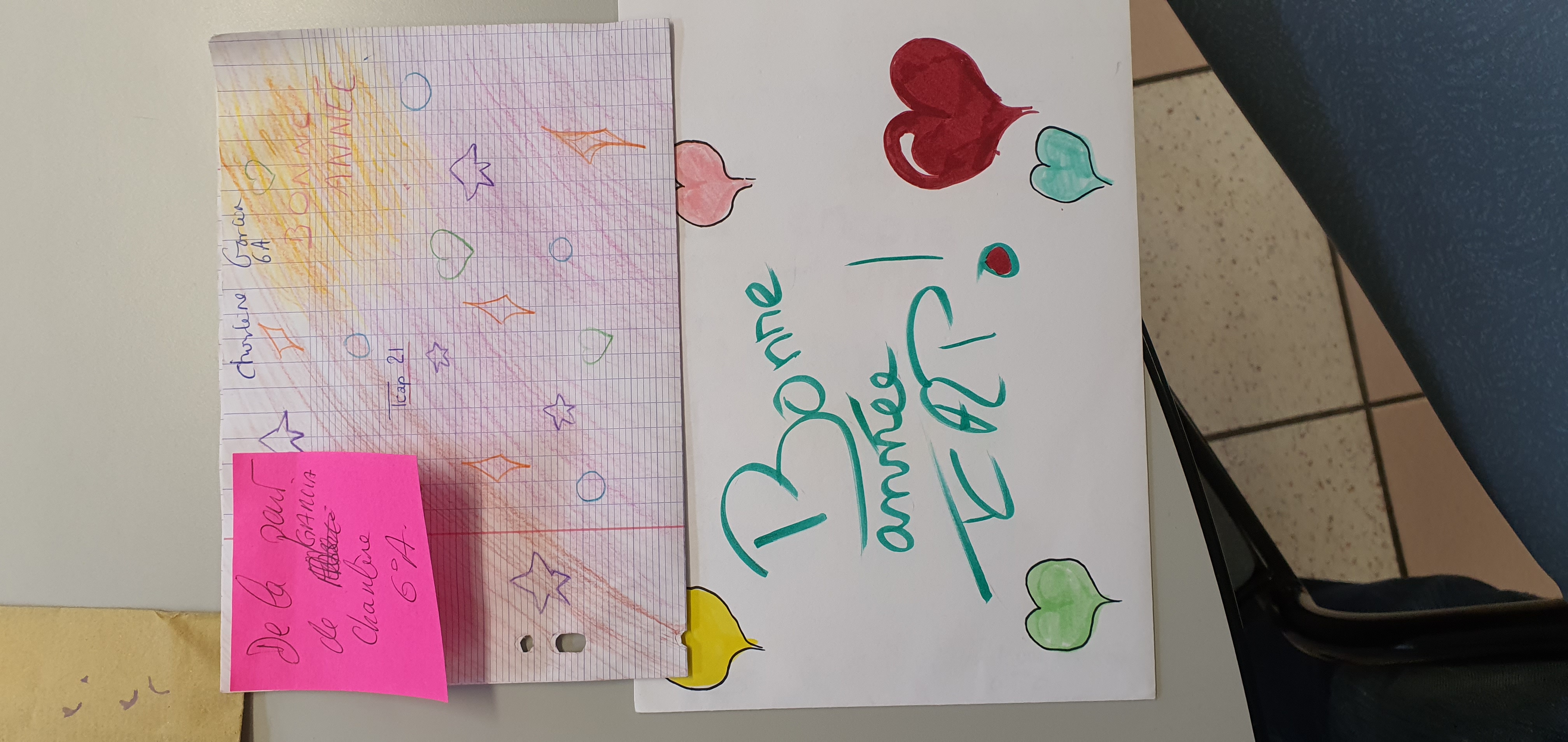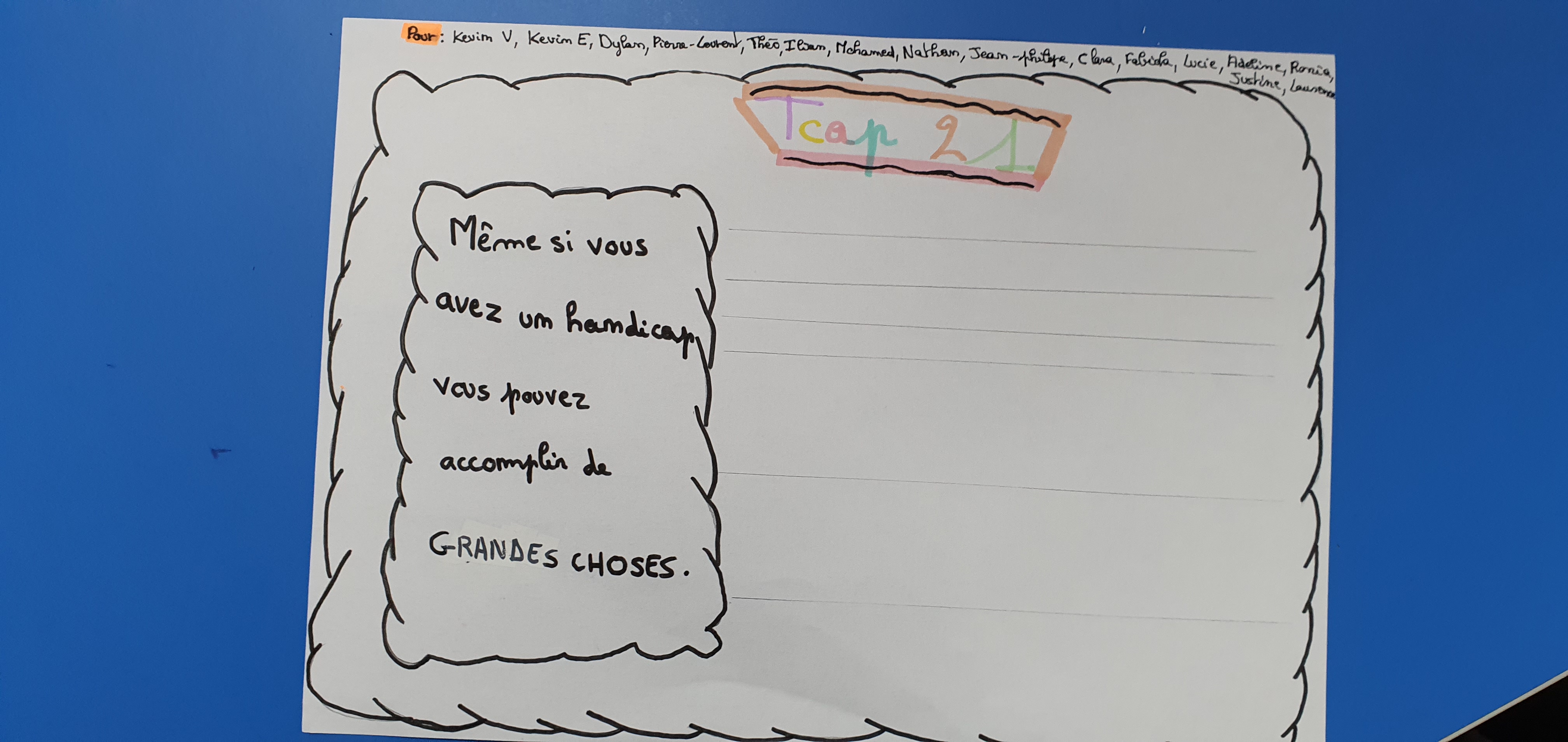 Que faire alors ? Ne plus sortir et rester cloîtré chez soi ? Nombre de parents et de personnes en situation de handicap ont appris à ne plus faire attention au regard des autres. Sortir et se mêler à la vie est sans nul doute le meilleur moyen de changer les mentalités et que tout un chacun puisse s’habituer à vivre ensemble. Accepter d’être regardé passe alors par des mots qui changent la donne en façonnant et en construisant un regard différent et constructif avec le temps. C’est ce qu’ont exprimé des élèves de 6è et de 5è aux jeunes de l’association TCAP 21 (dont les établissements Saint Elisabeth sont partenaires depuis plusieurs années) porteurs de trisomie 21 ou d’autres handicaps mentaux et cognitifs, en leur adressant cette année des cartes de vœux dont le sens rejoint ce que les familles de l’association espèrent : le handicap peut ouvrir aux autres personnes, aider à mieux les comprendre et à vivre ensemble. Tel est ce que ces cartes de vœux expriment.