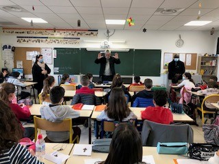 Dans un premier temps il est venu échanger avec les élèves de CM2 accompagné du Père Assalé et de Brigitte GRASSI. Les élèves ont présenté le travail fait en classe sur le Carême. Ils lui ont offert une croix fabriquée par leurs soins. Iris et Laëticia ont chanté à capella l'AVE MARIA. Mgr DUFOUR a ensuite béni tous les élèves. Quel beau moment ! .