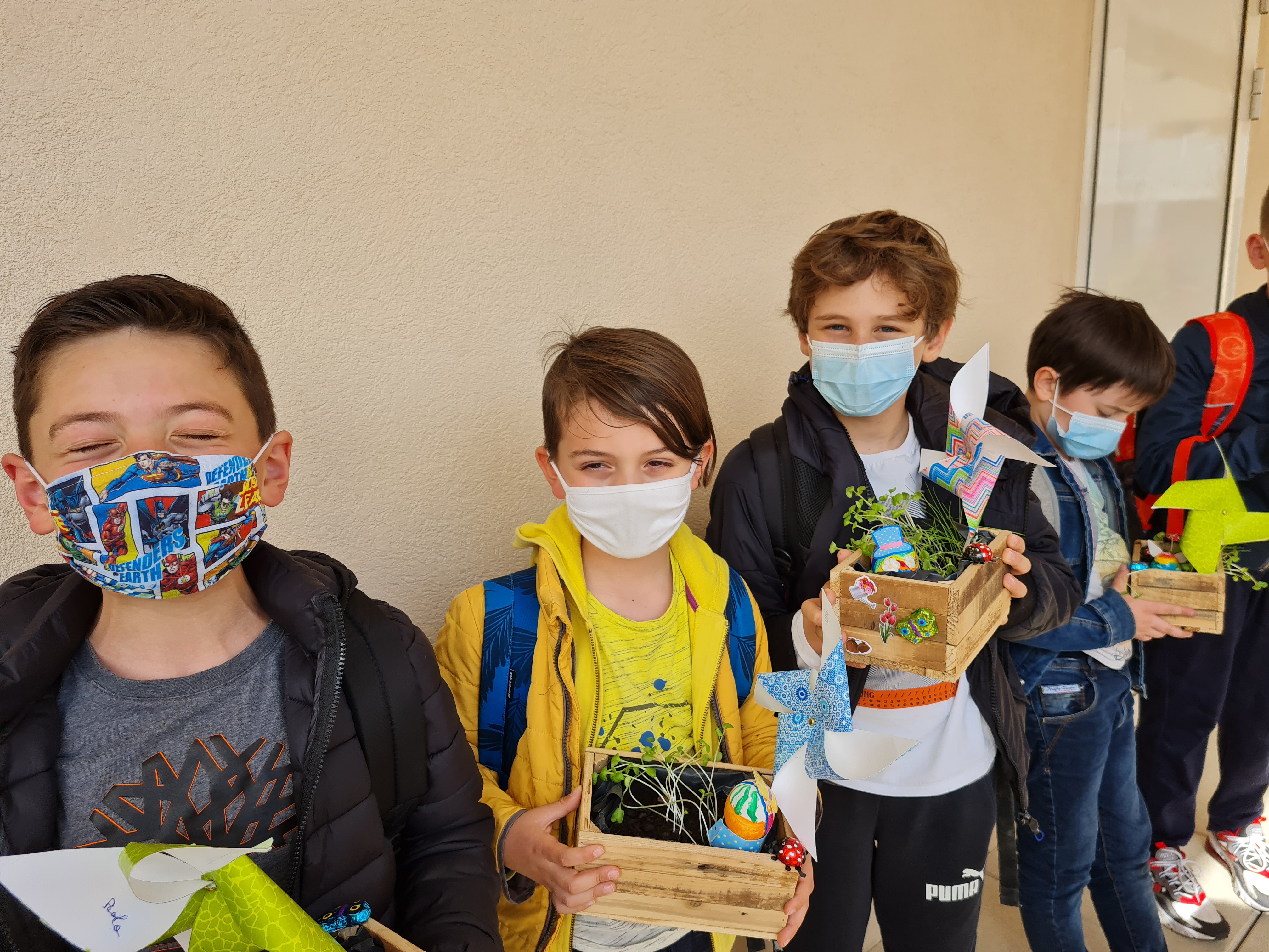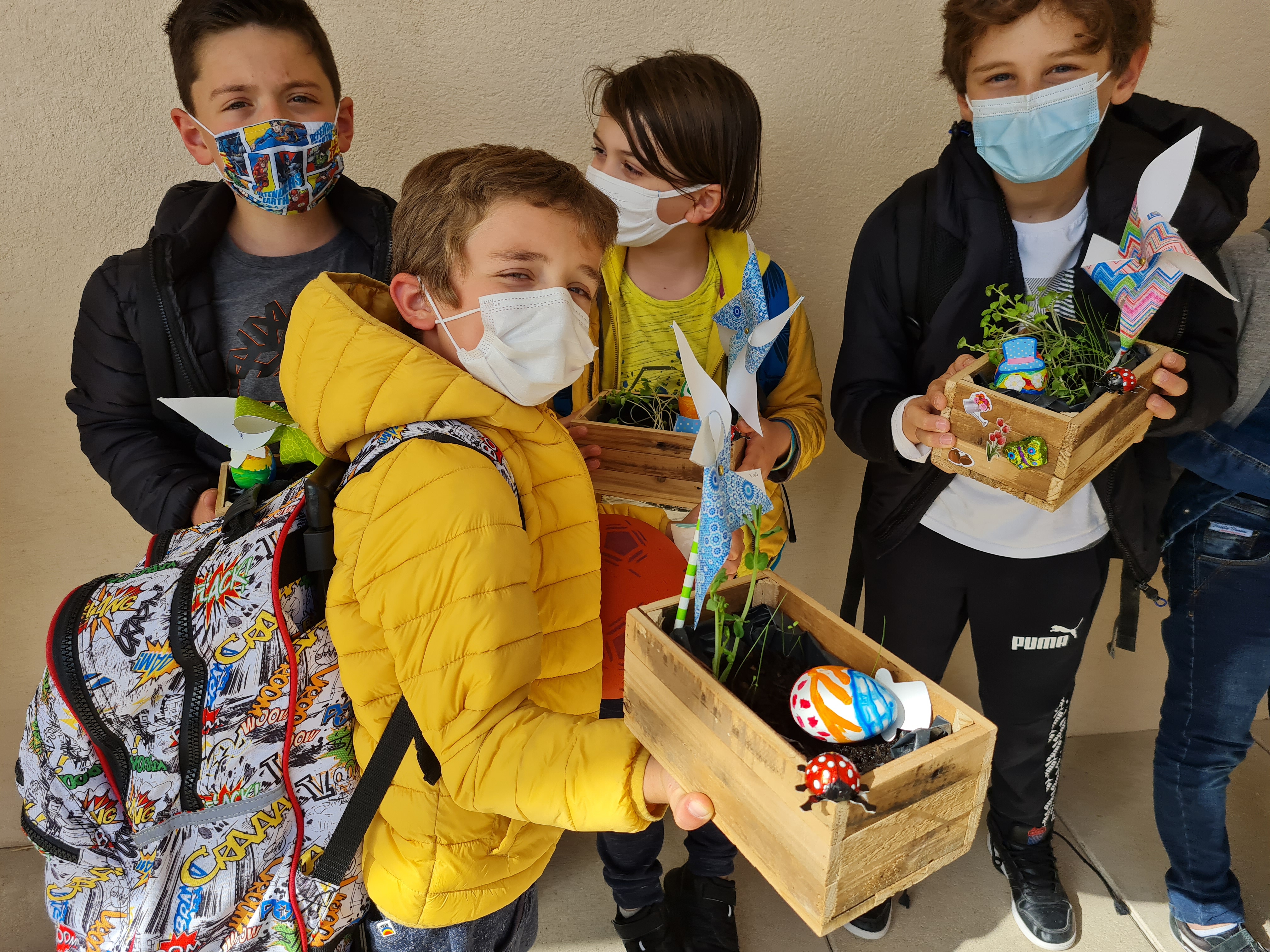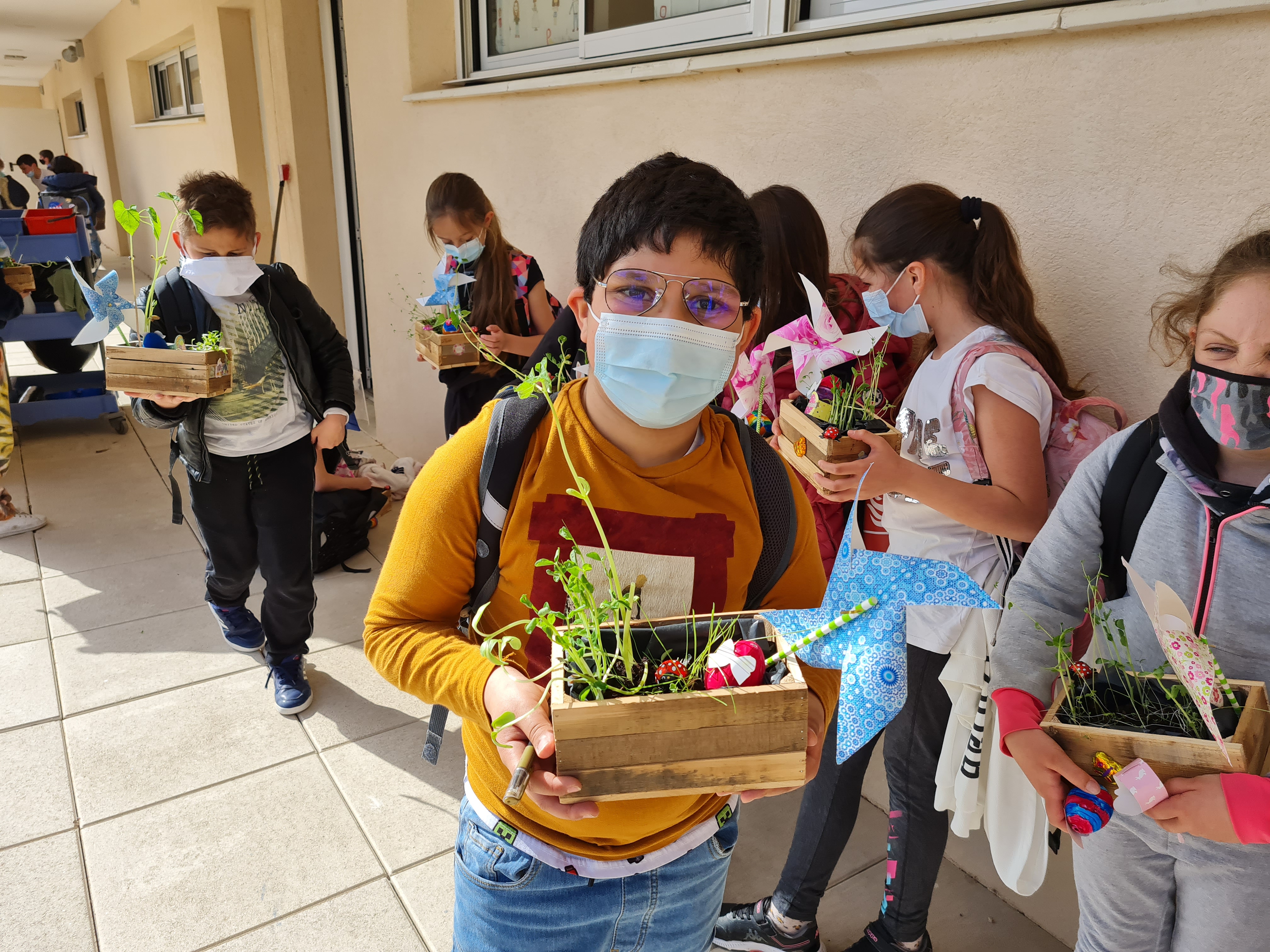 Les enfants partent avec leur petite jardinière pour le week-end de Pâques.